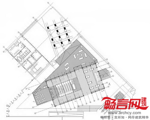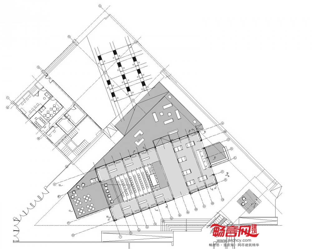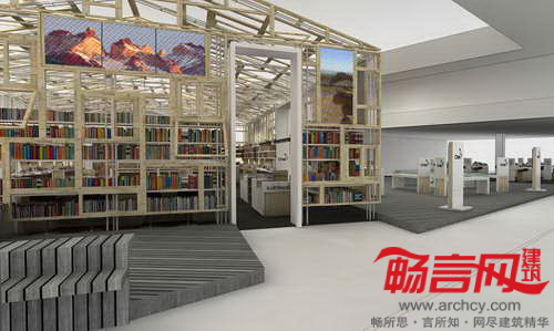 场馆包含了两层表皮——由木质窗体构成的通透外层,以及展览图书构成的临时二层表皮,同时为内部(书脊)和外部(纸张)增添了色彩。场馆内部实质上是个巨大的图书馆,涵盖了书展区、公共区和演讲台,能够同时用于休闲阅读区。