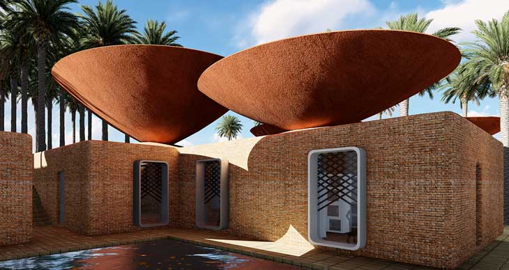 伊朗一半以上的国土都是炎热干旱气候,每年这一气候形式不断加剧。Urmia湖这类的大湖不断萎缩,直至消失,河流也处于干涸的边缘。因此,农民无法耕种,城市也遭受缺水的困境。BM工作室设计师对这一现实提供了双重解决方案。这一凹陷的屋面可以应对全球变暖,减少碳足迹,同时聚集珍贵的水资源。尽管有人认为,当地气候不允许雨水收集手段的使用,在没有收集之前,雨水就已被蒸发。但收集团队还是针对伊朗高原和类似环境,即降水量不到全球均值的1/3,而蒸发量是均值的3倍,做出了细化的设计。
