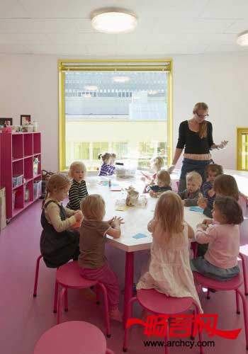 泰勒斯托儿所位于一块旧城市工业开发地和一片小森林之间,所以它成为了两个不同地理环境的过渡区域。托儿所有一个半开放的入口庭院,家长们在这里接送孩子。精心设计的外形和空间布置,使托儿所的室内室外都适于幼童活动。更别致的是,窗户的位置高低不一,这样显得既俏皮,又能使托儿所享受充足的阳光,同时又保证能看到窗外美丽的景色。最人性化的是,这些窗户都是为儿童专门设计,既能保护儿童的安全,又能很好的将托儿所室内教室与室外葱郁的山林和操场融合起来。