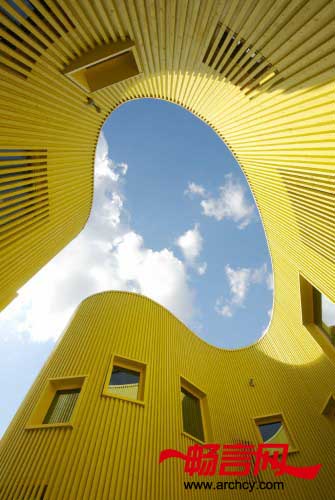 建筑的幕墙是由50X50的波纹形木板做成的,透过木板间的空隙,阳光可以从窗户直接照耀到室内。这样的设计使窗户若隐若现,十分具有朦胧美,同时,这也形成了建筑流畅的曲线形外观,如童话城堡一般美丽。此外,建造托儿所使用的材料也是经过精心挑选的,它不但质量上乘,而且既环保又耐用。