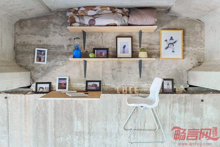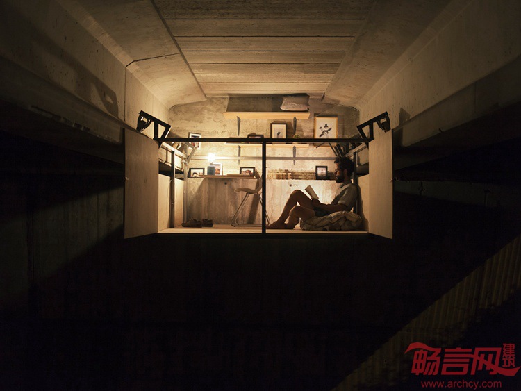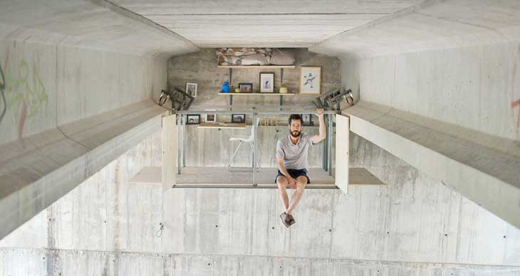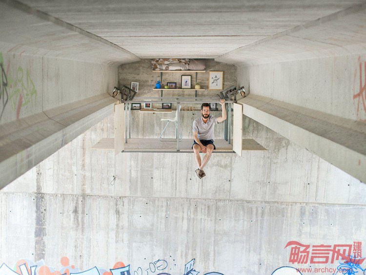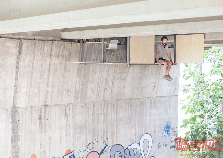 自学成才的设计师Fernando Abellanas在西班牙巴伦西亚一座遍布涂鸦的立交桥下方创造了一个悬挂的工作室,让混凝土桥梁成为其住所的屋面和墙面。设计师完成了家具和灯具的设计,仅花费了两周时间,就完成了这一木材和金属框架的项目。他不想透露具体位置,不过表示自己经常得到在受忽略的空间中做设计的机会。