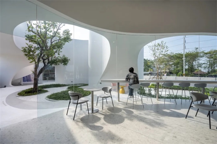 建筑规划巧妙地利用了三角形态的地块,建筑沿路延伸,形成三个核心区域:一是集酒吧和座位区于一体的温馨主入口,二是绿意盎然的庭院户外休息室,三是内部静谧的休息区和顾客办公区。