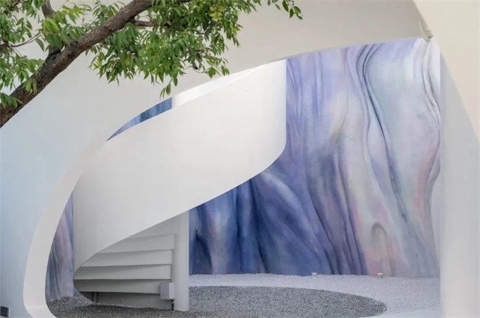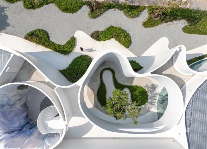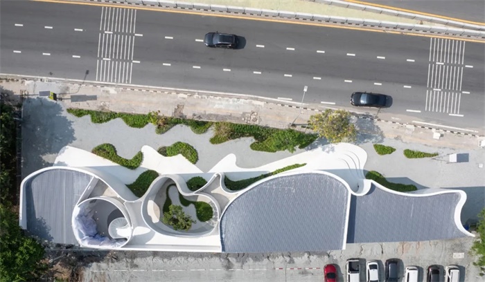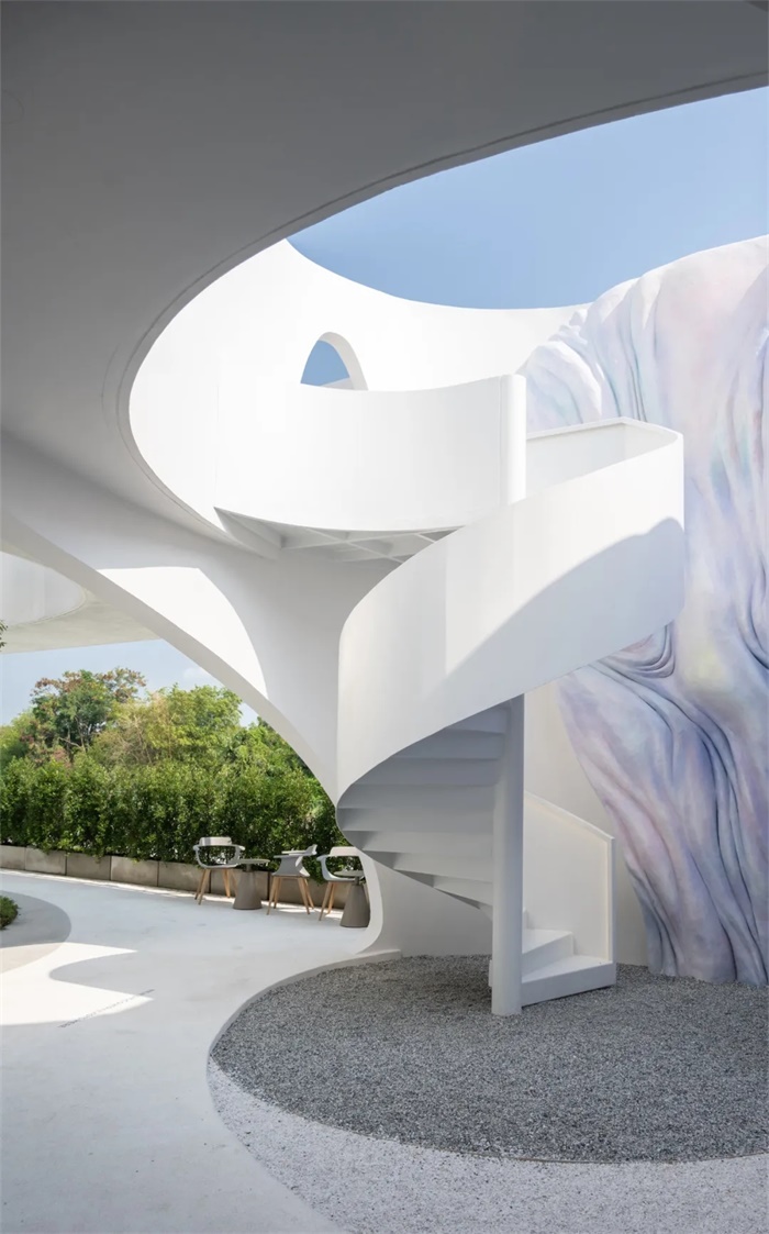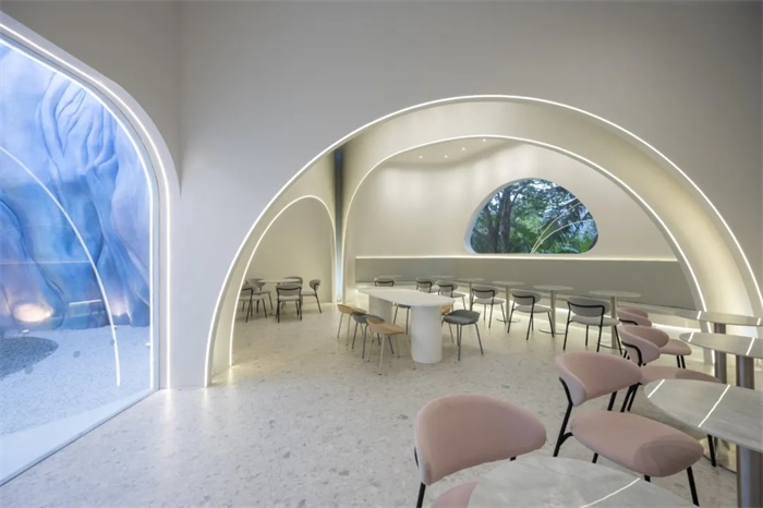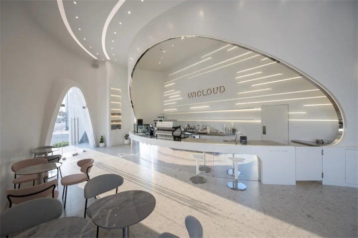 设计灵感来源于充满奇幻魅力的北极光,抽象地诠释了存在于大气层里神秘的光影秀。咖啡馆的建筑外形呼应了北极光的动感掠影,其结构沿着道路优雅地起伏变换,自然而然地与周围环境融为一体。设计以连续的蜿蜒线条将内外部所有的空间联系起来,创造出连贯的建筑探索之旅。