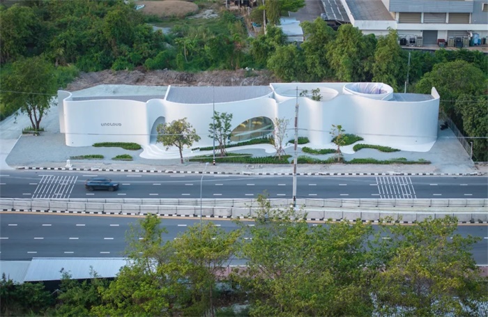 极光咖啡馆位于春武里府考林路(Khao Lam Road)的一块三角形空地上,地理位置优越,毗邻通往邦盛(Bang Saen)的主干道,背后壮丽的山景成为咖啡馆的赞美底色。