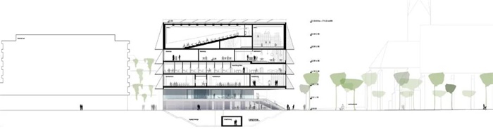 在广场层,一个宽敞的入口楼梯将建筑与公共空间连接在一起。上方的美食区为建筑物和开放空间之间的进一步过渡区域,并邀请人们留在户外。上层的密集排布有利于下层的退进,创造了更多具有吸引力的公共空间。新建筑与对面教堂形成强烈张力场,也造就了广场的独特气质。