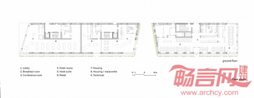 较为私密的公寓楼位于酒店建筑后侧。酒店和住宅之间设有一个口袋公园,面向南方呈现开敞特点,提供建筑之间的通道,联通公共流通区域的过渡区,绿色植物外立面。