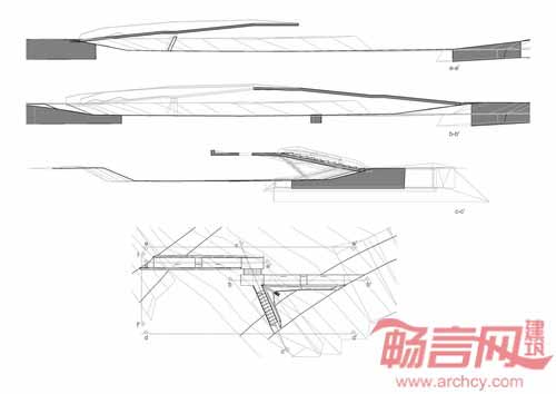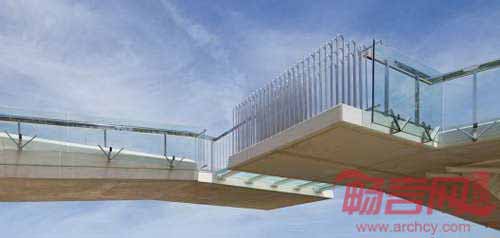 悬臂结构和Y型结构两部分的结合处竖立了若干钢栏杆,其间还设有一条玻璃走道。