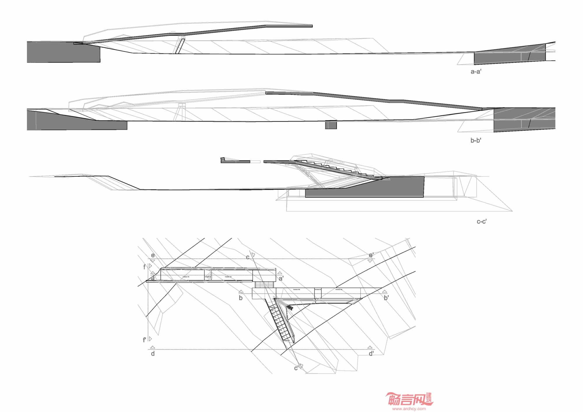项目梁结构灵感来自origami(日本折纸)艺术,当然材料不是纸,而改用了白色混凝土板。桥梁两部分具有不同的结构形式,一部分具有一条16米的悬臂梁,另一部分有Y型几何形态,包含桥面和阶梯,两部分的桥梁总长度超过了60米。