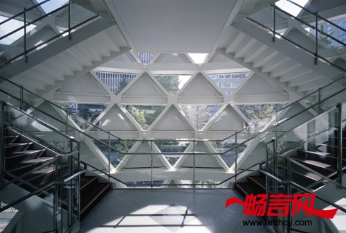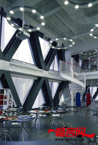 “我们并没有将它设计成那些千篇一律的水平并排式学校,而把它设计成一个能够容纳约10,000名学生的摩天大厦。我们想,一个学校的建筑不应该只含有教室,因此,我们还在大楼设计了多用途走廊和学校大院似的活动空间或者中庭,在这里,学生可以自然的交流。正是秉着这种理念,我们设计了一个三层高的中庭,将它称之为‘学生大厅’”。