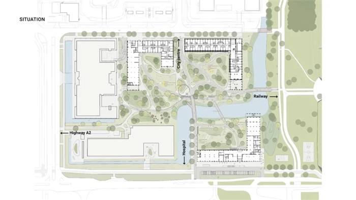 所有利益相关者都认为周围大范围的改造区域(Amstel III)存在问题。场地功能主要为办公区,不足以吸引人。医院是该地区的主要利益相关者之一。社会安全也是一个值得关注的问题。现在许多办公区都是独立的孤岛,由水系和绿化围绕的建筑组成。与此同时,一些积极的展望正在进行中,例如一些创业计划。目前最大的问题是:如何将这片分离的区域连接起来,使之成为一个整体?在OurDomain园区的规划中,这种连接即将实现,作为该地区深入发展转变的第一步。