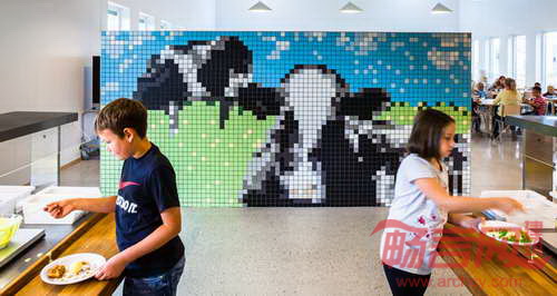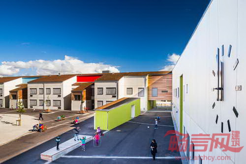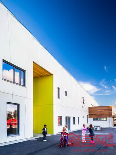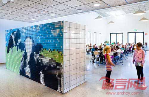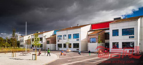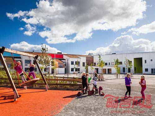 位于瑞典Lomma的Fladangskolan小学面向6-12岁儿童,学校共有12个班级,在校学生420人。L型的建筑如同从运河上岸的一条“鳄鱼”。二层学校建筑俯瞰西面的运河和南面的公园。学校包含除教室外的针线室、木工室、视觉艺术室和就餐室。白色混凝土建筑外立面具有规律图形,令人联想起附近的溪流、摇摆的野草。学校项目采用了强健材料,包含了景天绿化屋顶。