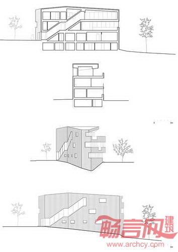 Local Architecture建筑事务所设计了位于瑞士洛桑附近的Rovereaz住宅。项目坐落于Chailly住宅区和Rovereaz乡村庄园之间的一块绿树密布的山坡上。建筑南面设有一列长长的玻璃窗,面朝日内瓦湖和阿尔卑斯山。露台错落有致,形成公寓向室外的延伸。每套公寓均有简洁的布局,独特的几何方案构成流畅的空间,为住户提供了多重视野。透明楼梯打破了沉闷的围护外立面,增添了一丝生气。流通空间采用清水混凝土,产生的空间通向不同楼层的起居区,所有服务功能均位于建筑一侧。