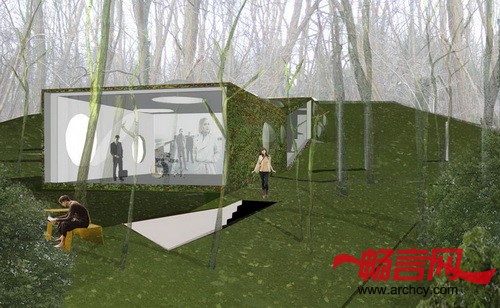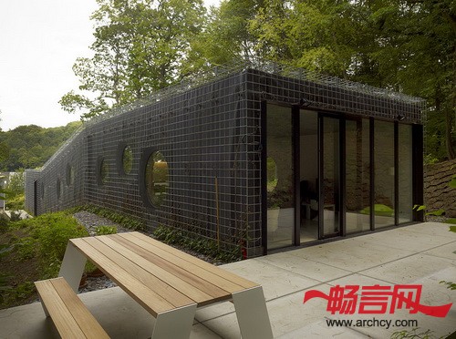 “这个住宅并不是一个典型的佛兰德斯建筑,它是一个长方形的建筑,横躺在小山的登高线上,根据山坡的梯度自然形成自己的外形。从外面看,住宅没有使用一块砖头,而是使用绿色的植物和景天属植物进行伪装,这让它完全的融入了大自然。