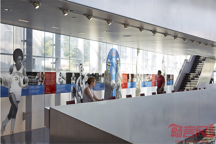 堪萨斯大学Debruce中心由Gould Evans设计,是一系列博物馆和学生公共空间的集合,其间收藏了James Naismith于1891年完成的仅有两页、13条的篮球规则,而目前的规则则多大45576字、153页。这一珍贵的手稿也成为催生这座耗资1200万美元、32000平方英尺设施的催化剂。中心意义将超越一个比赛日目的地,学院希望其在整个学年能服务于学生。