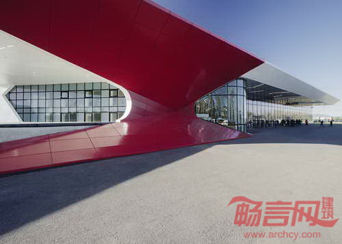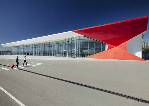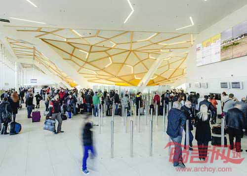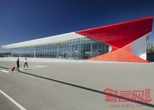 由荷兰UNStudio建筑工作室设计的Kutaisi国际机场一角被设计成利用定位的明艳红色。UNStudio建筑工作室设计的航站楼具有很大跨度,创建了利于导航的无阻视野,红色的一隅成为辨识度的焦点。设计师表示,“新机场的设计体现了场地的特色,这一特色会令旅行者感到亲切。航站楼建筑大跨度、开放空间和高屋顶令离开和返回的旅程变得特别,这种建筑姿态在过去的火车站建筑中非常常见。”航站楼内部,天花板上一个木梁网格结构吸引了人们的视线,创立了旅客聚集的中心。
