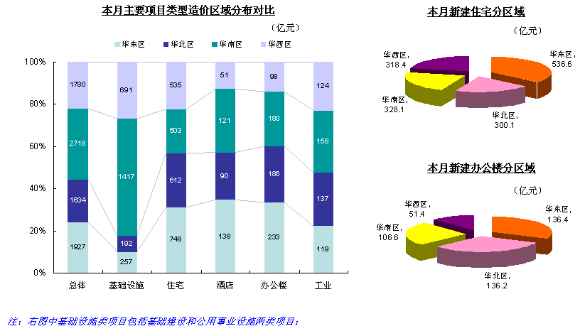 进入6月份,从总体来看,华南区域是本月国内工程项目最集中的区域,该区域内基础设施类项目增长比率较大,绝大部分的基础设施类项目主要集中在该区域内;住宅项目分布较为均衡,酒店和办公楼项目则主要集中在华东。而对于本月新开工的项目,华东地区新建住宅和办公楼项目均排名靠前,区域总造价分别达到了536.6亿元和136.4亿元。