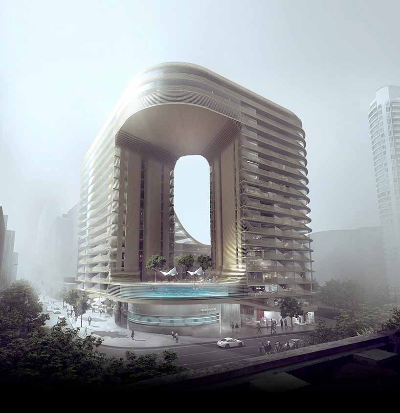 Crown国际控股集团展示了由高田宏一建筑事务所设计的多用途住宅综合体方案。项目位于悉尼绿色广场入口,Infinity by Crown方案旨在通过建筑形式吸引公众,达到休闲与住宅活动关联的目的。人们在建筑外围不停走动,连带交通车流,形成流畅的建筑形式。综合体成为具有吸引力的地标,而非静止不动的摩天楼。建筑结构考虑到居住互动性和未来愿景,体现了当代建筑概念影响。设计特点是两个环形结构的融合:一个环形活跃城市广场和街道景观,另一个为居民提供休闲设施和开放空间。