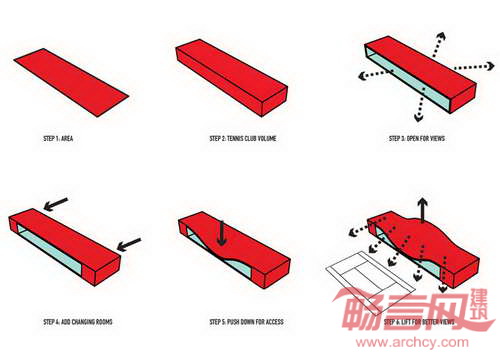 荷兰MVRDV建筑事务所为阿姆斯特丹东部的Ijburg人工岛建造网球场的方案获得了规划批准。除了为200名观众提供座位外,Couch网球场还包含新的更衣室、厨房和储存设施。设计方案旨在使网球场成为不同年龄层人群的聚集场所,全年365天向公众开放。项目的内部空间将取代先前的设施,其多功能区域将满足不同活动的举办要求。悠长的建筑正面是透明玻璃设计,网球馆自然光线充足,在室内可以欣赏湖泊的优美景观。场馆外部保温材料采用EPDM聚合物,材质和色彩与红色粘土网球场地一致。