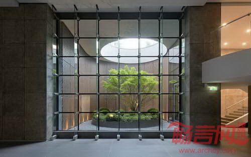 Unipol总部大楼位于意大利博洛尼亚,项目涵盖了1万平米建筑面积,旨在对区和城市之间核心地带进行重新开发。项目公共绿化区域委托给Frassinagodiciotto De Castelli公司,该公司负责完成墙面、配件和金属设施的制造。项目的核心元素是中庭,这一环形空间吸引了大众的视线,聚集了人群,其中最引人注目的是中央的一棵大树。弯曲墙面材质是抛光钢板,其表面利用激光切割创建了方孔图形,从上至下,穿孔取得了视觉密度的协调。室外绿化植物种植在耐候刚容器内,周边是低矮的绿色灌木。