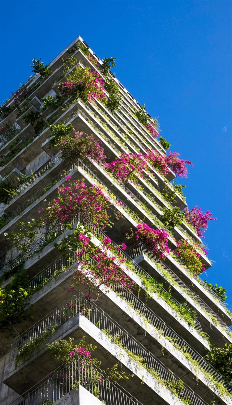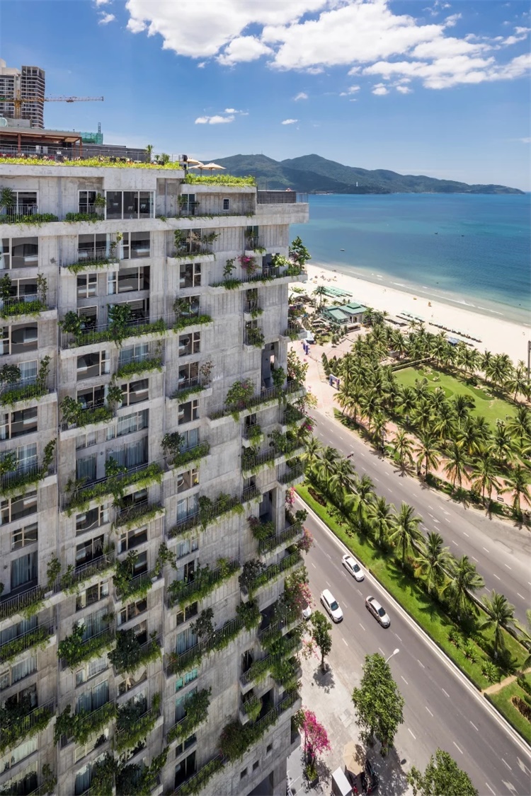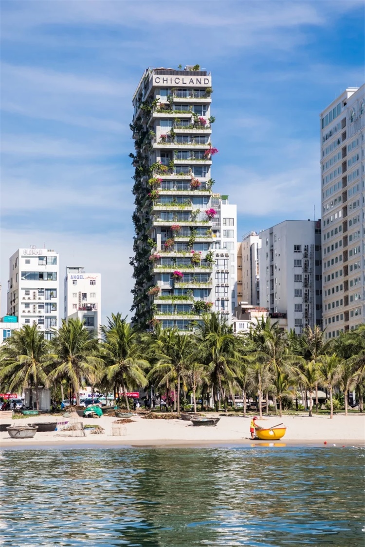 武重义建筑事务所完成了越南中部旅游城市岘港的海滨酒店设计。坐落于Vo Nguyen Giap路,面向My Khe海滩,Chic Land酒店让宾客可以享受广阔的海景,灿烂的阳光,清爽的海风和清新的空气。项目高72米,外立面和阳台带有蓬勃的绿色植物。建筑师武重义表示,融入的绿化维护十分简单。