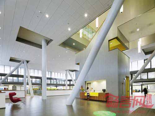 鹿特丹设计公司Ector Hoogstad完成了埃因霍温理工大学建筑修复项目。大学数学系和计算机系占据了W-hal的顶层,用来存放机器和试验设备的面积达10000平米。一层天桥将建筑与周边结构连接起来,全景阶梯通向图书馆。增建部分位于一个金属结构内部,通过20跟细长的钢柱支撑,“漂浮”在空间当中,内部空间具有一览无余的视野,适合成为公共活动场所。建筑还设有餐饮、零售、学习和休息区域。
