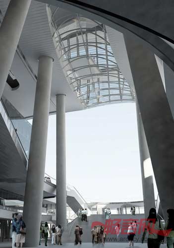 该建筑是公开的、大众的有机体,是人们可以随意进出的综合建筑。建筑内设一系列斜路、电梯、阳台和公园。所有流通的内部结构都很柔软弯曲,好像代表大众活动的优雅,但外部结构却又很结实。柔软度从公开零售店到隐秘的戏剧院成垂直变化。整个流通结构在空间上和“大厅”相连,通过剧院主要大厅的玻璃地面和下陷的商店相连,并会展示出上方的大部分结构。