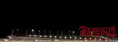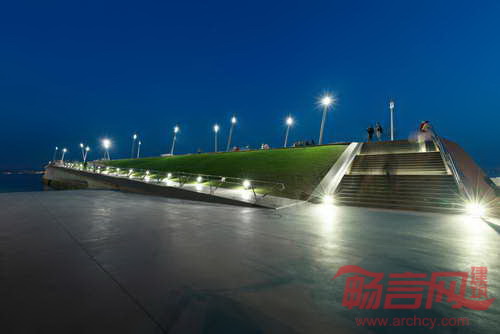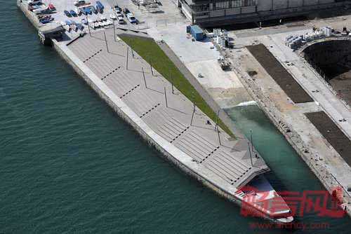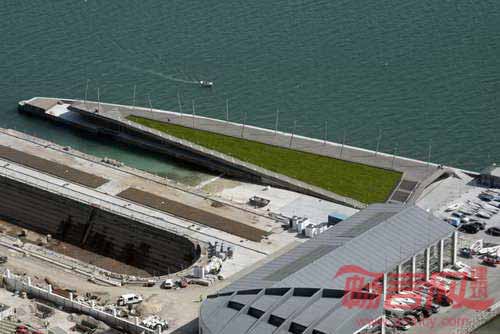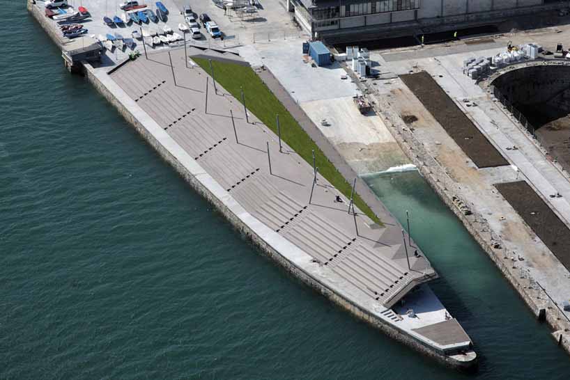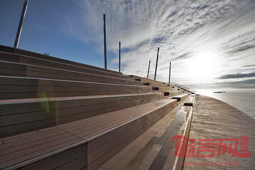 折叠平面容纳绿化坡道、顶部的长过道、面朝水域的观众区。