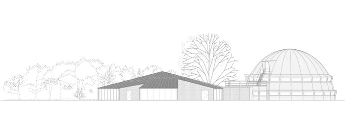 展馆采用传统建筑材料及技术建造。外墙采用深红色的砖砌成,内墙是一堵混凝土柱的砌块墙。开口有两种类型:(1)圆柱形玻璃幕墙;(2)嵌入式砖墙中的门和方窗。地板为抛光混凝土板。屋顶采用沥青屋面覆盖的木结构框架系统。