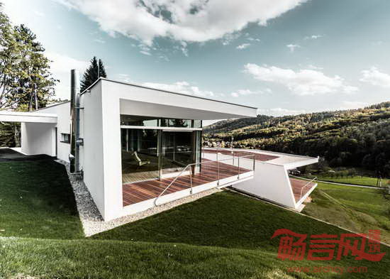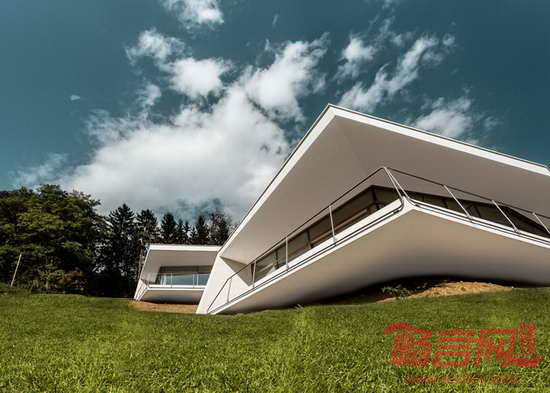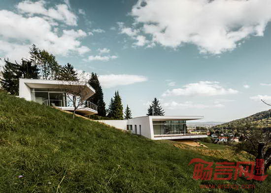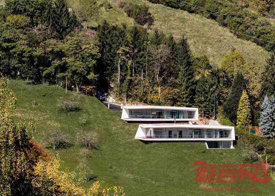 澳洲LOVE建筑事务所设计了位于奥地利格拉茨的2B山间别墅。项目位于面朝峡谷的山腰上,包含两座玻璃立面的混凝土建筑。业主是祖孙三代人,他们的住宅包含两座楼和一个延伸到小山一侧的车库。