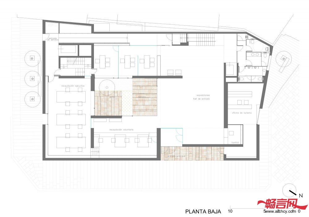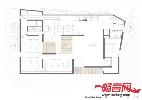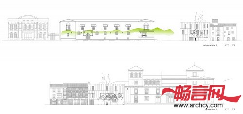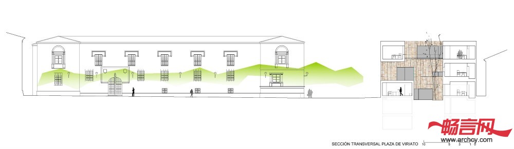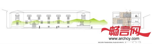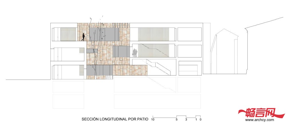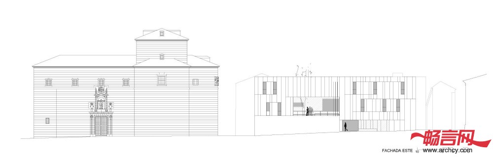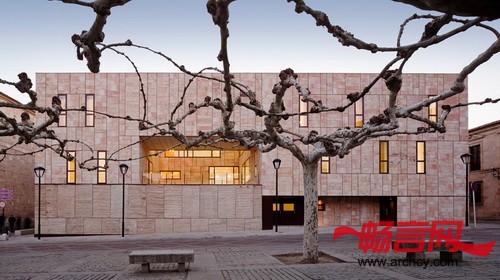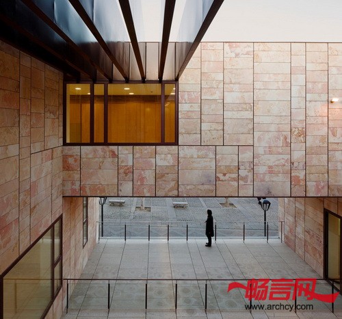 幕墙和庭院材料都是用的Zamora当地 的Arenisca石材,这与周围历史性建筑使用的材料保持一致。办公楼的幕墙是内外通风的,它不像其它建筑一样把里面的建筑系统遮盖住,反而让里面的钢结构能够看得见。低处几层是石板底座,这也是为了与周围的历史性建筑相互呼应。水平石板组成了建筑的另一层幕墙。