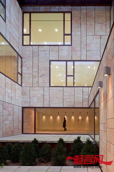 窗户有两种类型。第一种是长条窗户,它使用在朝向广场和街道的一侧。另一种就是大片玻璃窗,它们能让特定空间的照明和光线效果达到最好。从内部庭院上来讲,在这一面使用大块玻璃,主要是为了避免与周围看起来比较结实刚硬的建筑形成强烈的对比。