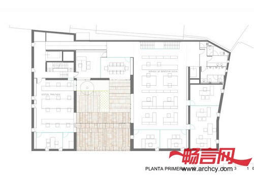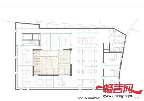庭院自然的分出了室内各个空间:北面是大一点的空间,南面是开放明亮的办公区域,大部分职工在这里办公,西面有两个小办公室,东面是会议室和办公室。北面有几个封闭办公室,它们与开放区域相连接,这是给那些需要更好的隐私性的职员使用的,而同时又能与其它区域保持联系。另外,室内空间的设计比较灵活,这让建筑以后可以灵活的变动空间。