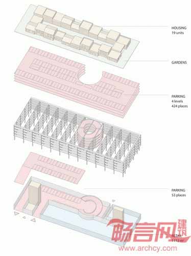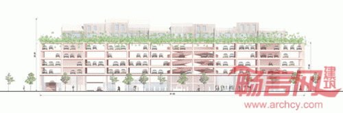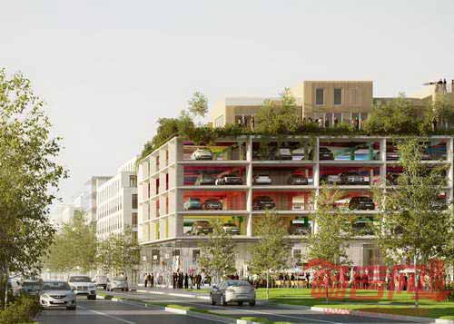 Brisac Gonzalez公司设计了位于法国波尔多的一座多层停车场项目。项目停车空间位于底层商铺和顶层住宅之间。项目包含450个停车位,此外涵盖1400平米零售空间和19套顶层花园公寓,增添了建筑在白天以外时段的功能性。设计师表示,“许多停车场在办公时间结束后处于闲置状态,造成了活动死角。我们引入住宅和零售空间就是为了解决这一问题。”设计师设计了一系列一室到三室公寓,提升了空间利用率。公寓周围的公园提供了公共户外空间,其围绕中央庭院设置的方式参考了波尔多传统住宅设计。公寓将采用轻质交错层压木材,可减轻对于下层车库的荷载。