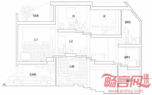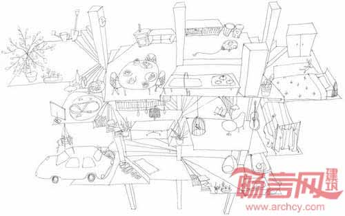 底层三根结构柱均匀排布,从地面通向屋顶。楼梯从房屋入口处通向二层地面。住户可以从相互连接的空间中缓慢有序的往返。设计师灵感来自线圈的复杂排序,室内部分的逻辑安排显示出生命物中的内在次序。