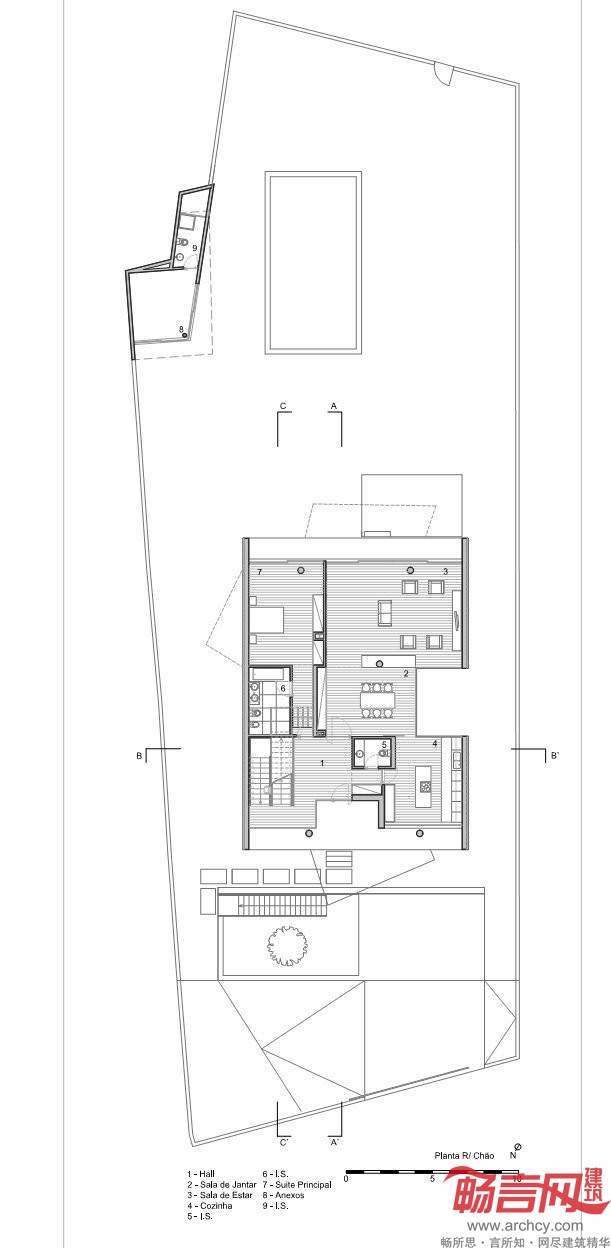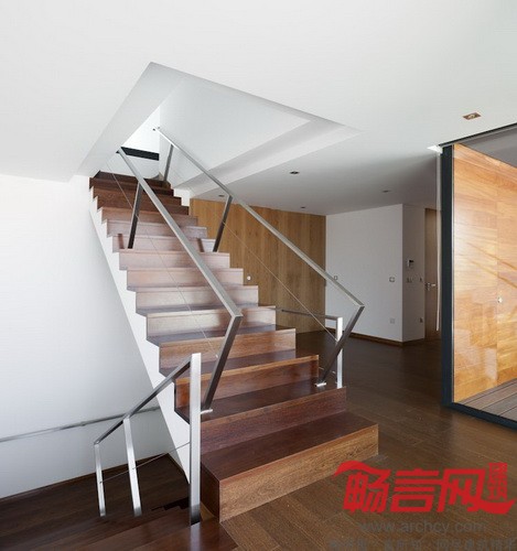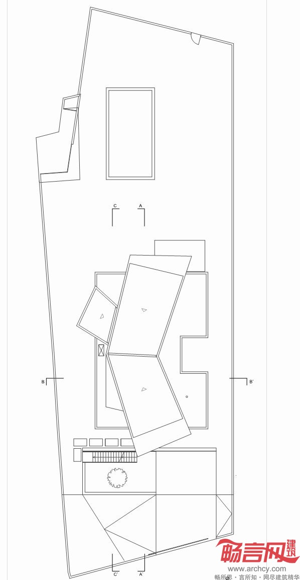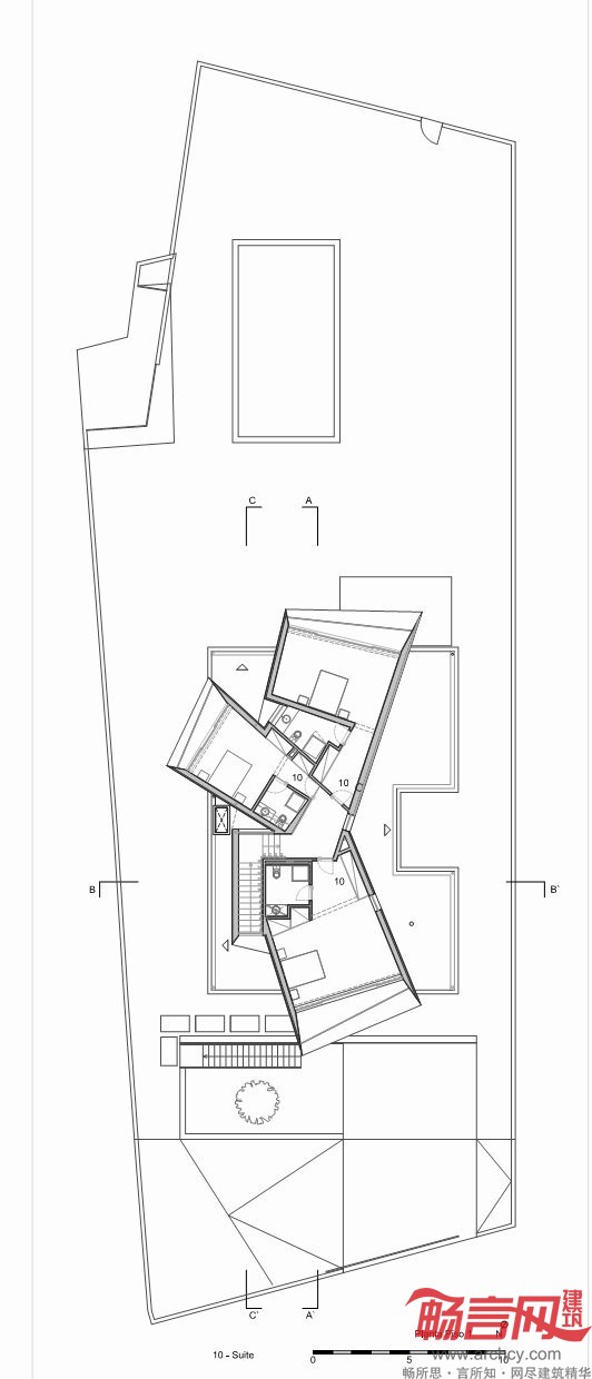 房子建筑总面积为600平方米,由两个迥然不同的部分构成。下层的楼体形状更加规则一些,这里主要分布着一些公共功能区域,比如门厅、客厅、餐厅、厨房、卫生间和家庭办公室等;而楼上的部分则比较私密,主要为卧室和卫生间,每间卧室朝向都不一样,房子的2楼构成一个楔形,与1层形成鲜明对比。