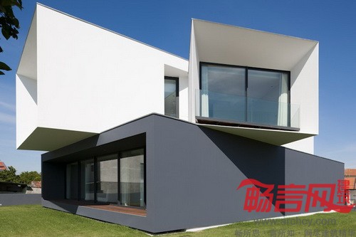1楼公共空间的设计比较严肃,墙体使用了灰色调,与绿色草坪形成鲜明对比;而2楼空间设计则相对活泼一些,墙面被刷成白色,而且每间卧室仿佛是部分重叠在一起的。