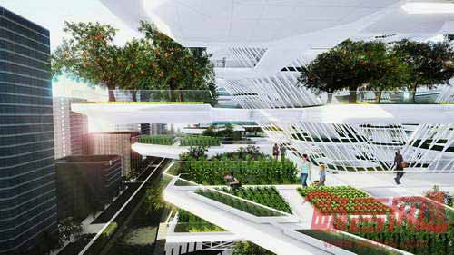 布鲁克林Aprilli工作室设计了位于韩国首尔清溪川一侧的垂直农场项目。项目位于城市高密度区域,提供当地食物,通过水源、空气净化和可再生能源等途径改善整体环境质量。通过对食物生产场地的架高,作物生长得到更多的阳光和空气,腾出一层公共开放空间。项目构想成“巨型树木”,包含四个成分:根部、树干、树枝和叶片。建筑采用轻质结构,具有多种环境优势,能够容纳多样化的农业活动。白天阶段,太阳能板产生的电力可用于夜间照明和供暖。城市天空农场创造了自身微气候,保持城市社区的气候平衡。