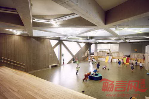 环绕中央大厅的走廊形成了供儿童使用的双倍空间。大厅大约比一层低一米,形成楼梯结构,和游憩走廊一道,组成了独立的开放空间。建筑的六个“花瓣”包含了教室、厨房、餐厅、行政办公室。星形结构使室内区域采光非常充足。