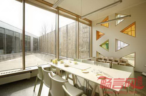 建造系统和材料:中心部分采用就地灌筑混凝土。建筑蓄热量相当大,设计最大程度降低春季和初夏季节降温的需求。建筑的力学设计和自然通风得到了结合。所有房间都有充足日照。儿童教室朝南,面向露天游玩区域。预制混凝土用于包含三角窗户的墙面,由于三角形玻璃窗直接塞入混凝土墙面,工程的精确度很高。