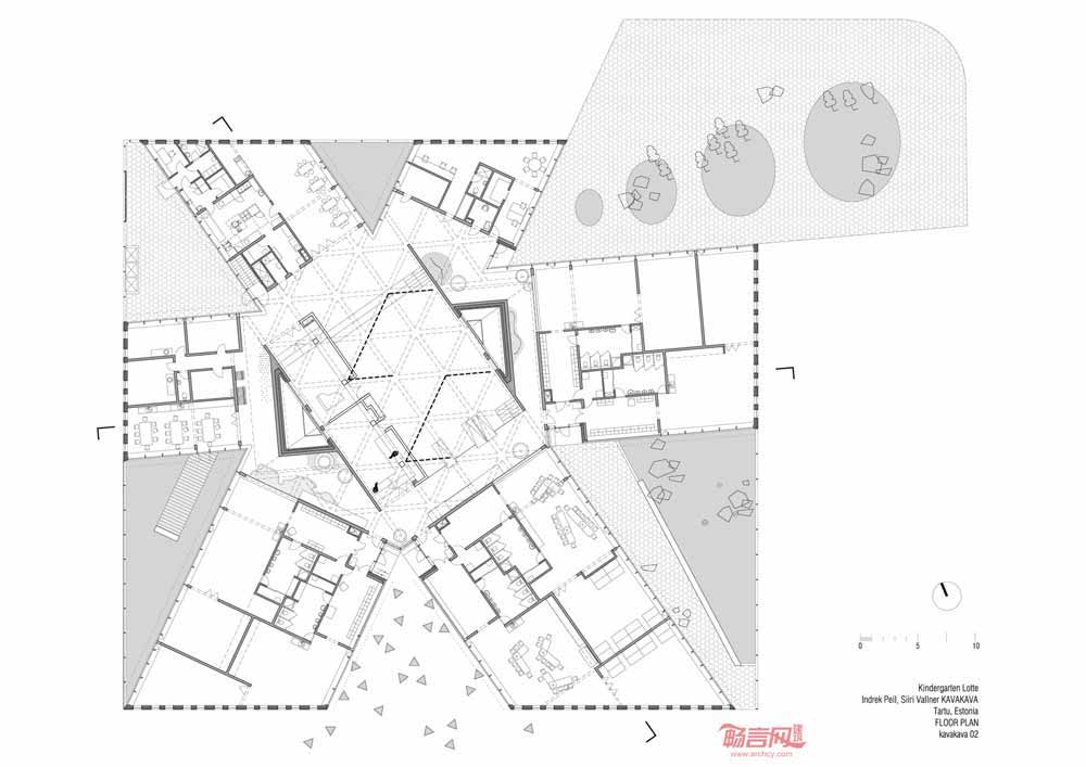 幼儿园布局呈现出六角星形状,设计师希望避免狭长走廊,并营造有序的户外院墙和街道空间。建筑位于场地一角,南侧预留出用于儿童玩耍的区域。