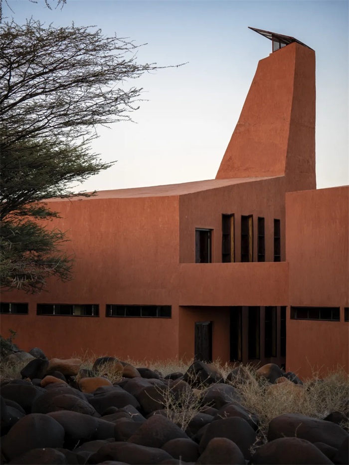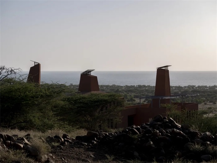 项目尊重当地独特的地形与自然环境,依坡而建。延伸而出的屋顶露台提供了观赏图尔卡纳湖的绝佳视角。露台由爬藤植物包裹遮阳,扮演了一个理想的室外聚集会面地点,以及非正式灵感交流的场所。