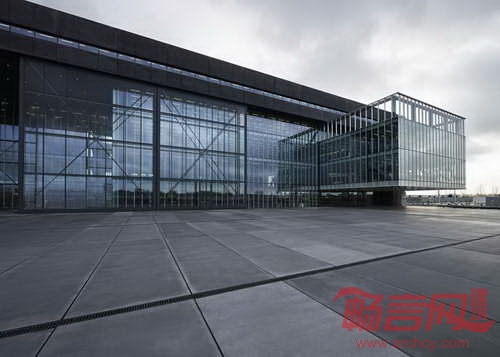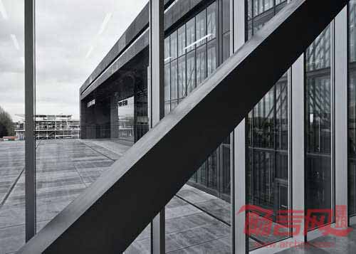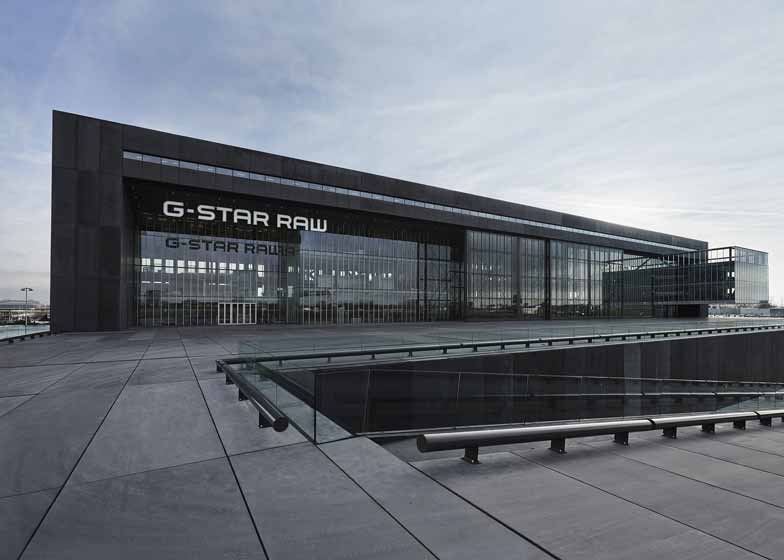 荷兰OMA大都会建筑事务所设计了牛仔服装品牌G-Star Raw阿姆斯特丹总部。项目包含混凝土外壳、玻璃核心和仿佛飞机库的立面。项目坐落于Zuidoost工业区A10公路一侧,设计借鉴了业主品牌的军事化美学品味,运用了深色冷峻的材料以及庞大的体量。建筑长度达到140米,位于基座之上的建筑高于道路平面。建筑外层被黑色混凝土框架包裹,内部容纳了承重设施,室内区域中央设有一列玻璃柜,陈列了品牌创造性产品。