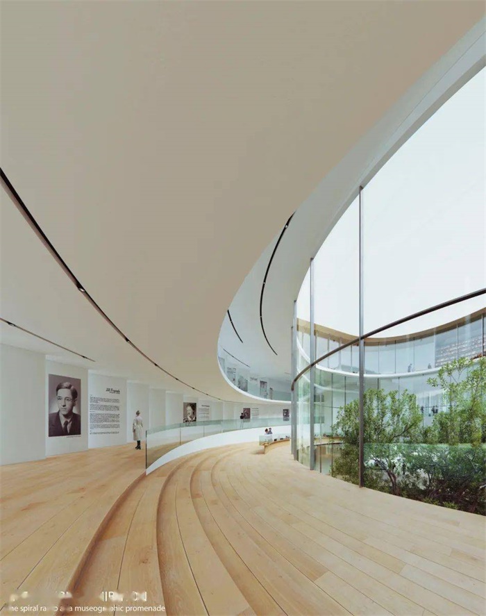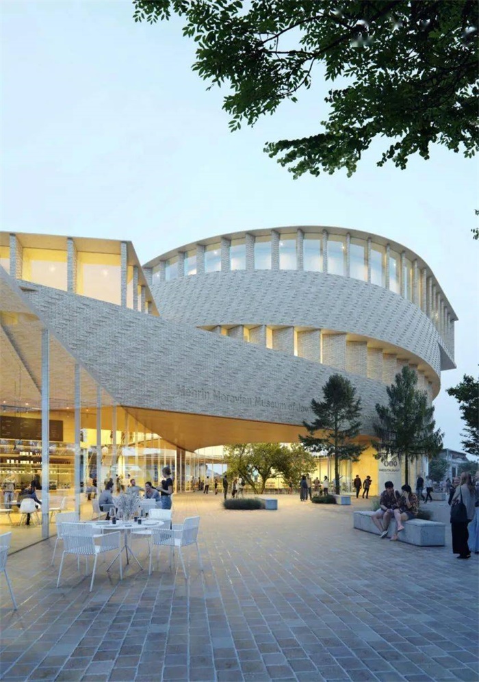 摩拉维亚犹太博物馆,位于捷克第二大城市布尔诺市, 隈研吾事务所设计的方案是一座开放且温和的丝带状建筑,建筑流线从地面开始,到顶层结束,视野开阔,并在内里围合出了一个庭院。这座博物馆是犹太文化影响下的作品,旨在向公众展示犹太人在摩拉维亚存在的的历史和文化。