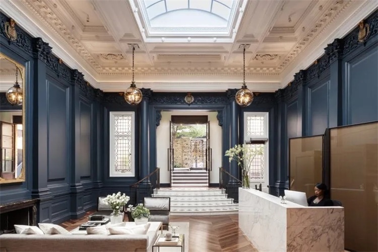 原火险公司的会议厅改建成为了住宅楼入口门厅,室内设计尊重及保留了原历史元素,是对该空间的的重新想象
