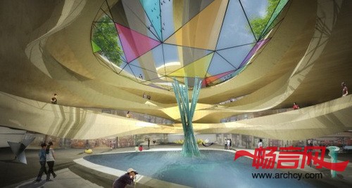 既是中庭又是天井的“雨水斗”可以将雨水收集起来。下雨时,雨水会形成一个非常有趣的瀑布,流进一个巨大的玻璃漏斗里,然后被收集到一个中央蓄水池中,用于灌溉和其它非饮用用途。收集来的雨水也可以应用到“水雾系统”中,用以降低室外空间的温度。这里还有污水处理系统。