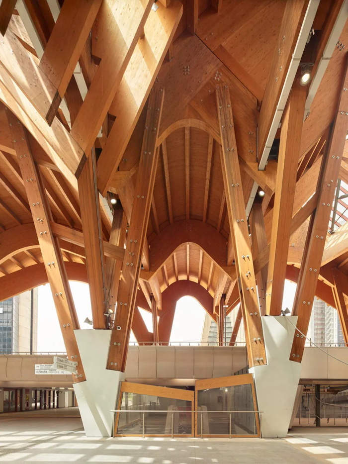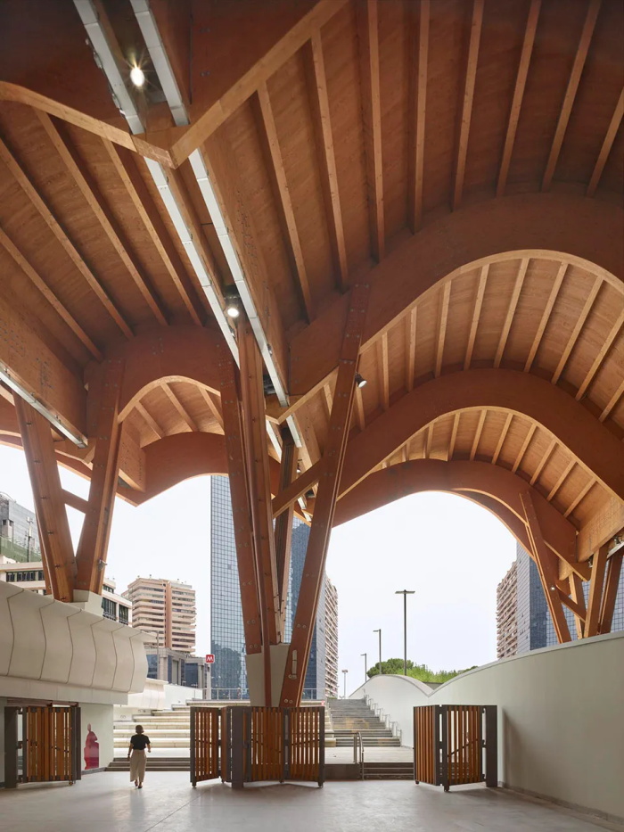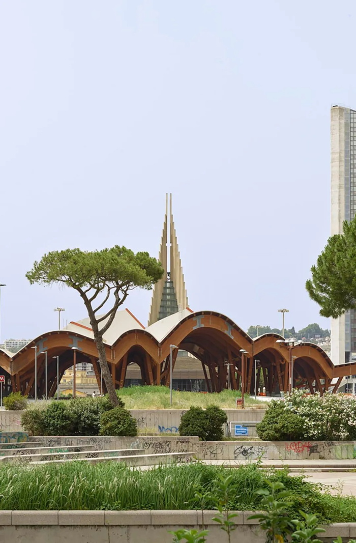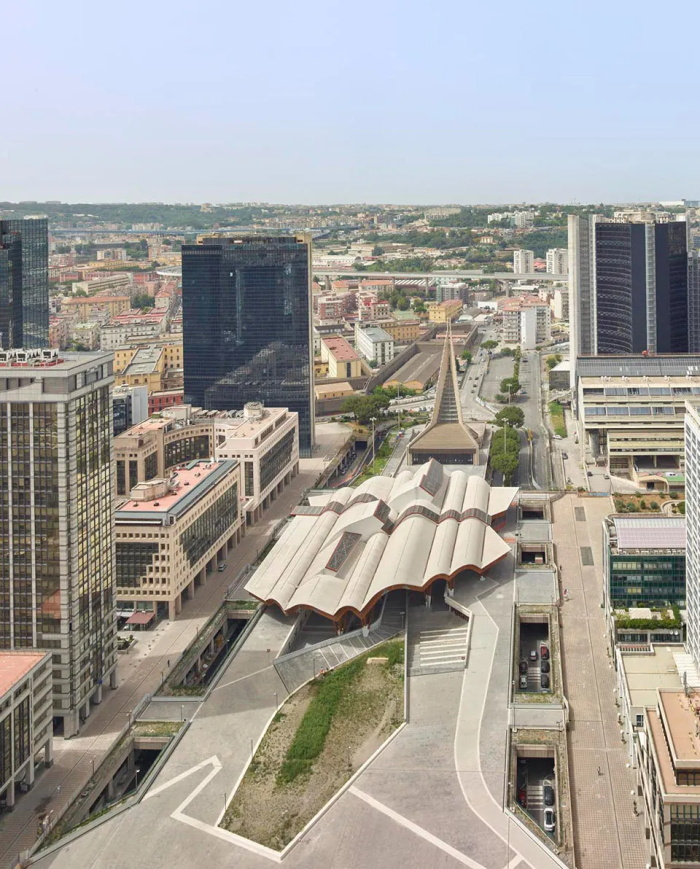 在“那不勒斯中央商务区车站(Centro Direzionale di Napoli)”的设计中,Benedetta Tagliabue及其EMBT事务所试图在城市的天然火山地貌与上世纪70年代由丹下健三(Kenzo Tange)设计的人造场地之间建立新的联系。拱顶是EMBT建筑事务所的标志性设计元素之一,拱形天花也向传统火车站的经典元素致敬,而整个车站的造型则意在营造出“林间漫步”的感受。