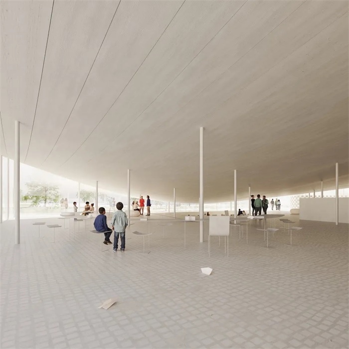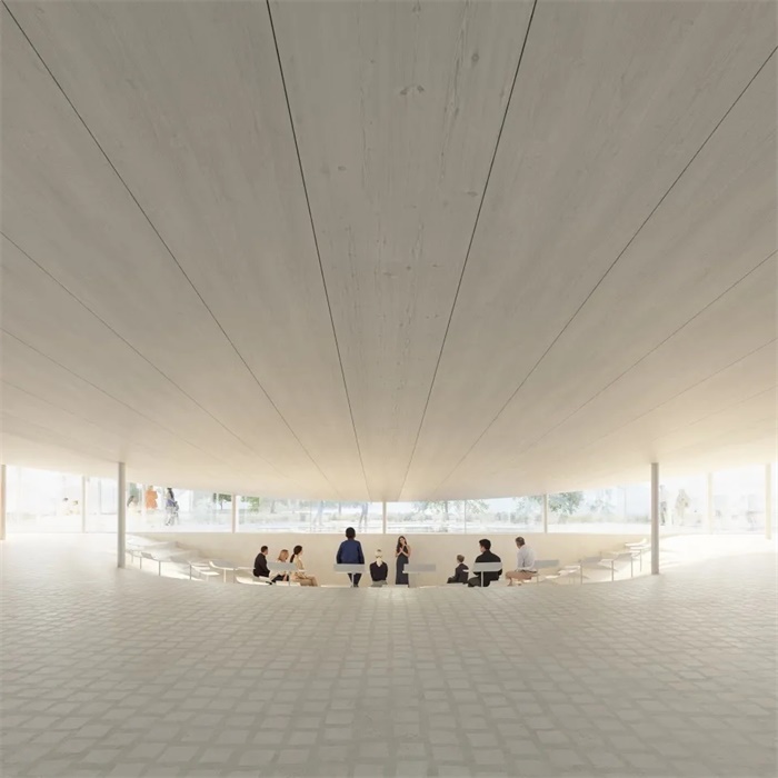 BIG为纸艺博物馆设想了一座新的轻型屋顶结构。该屋顶就如同一张纸,轻轻落在现有建筑上,为周围的新功能创造出空间,将新旧建筑包容在同一屋檐下。现有的建筑外墙将增加一层以折纸为灵感的纸艺隔音层,该设计由BIG与几位纸艺术家合作完成。