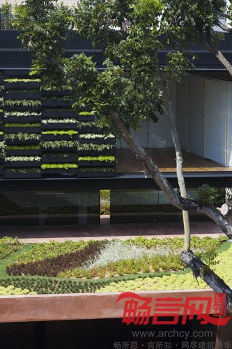 “我们在房子二楼的正面墙壁上安装了一个垂直的绿植园,其首要用途就是遮风挡雨,起到窗帘的作用。”设计师说。