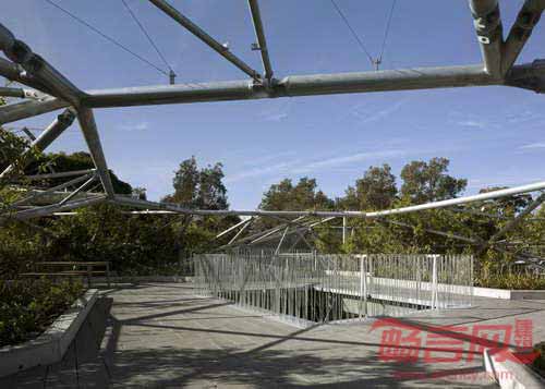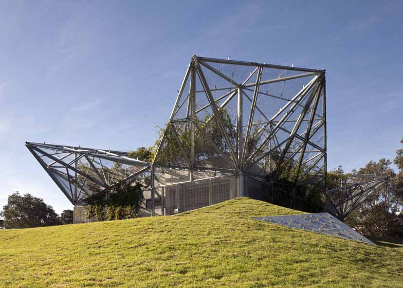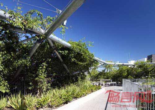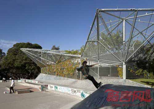 澳大利亚Collins & Turner建筑事务所设计了位于悉尼郊区Waterloo、带有植物覆层金属顶棚的青年社区中心翻新项目。项目通过设计俯瞰Waterloo Oval滑冰公园的中央庭院和景观屋顶,为城市住宅和健康机构Weave增建了一个休闲设施。倾斜的框架包含结构杆和金属网,材质是镀锌钢,用来支撑上方的植物。设计师表示,“随着顶棚上的植物不断生长成熟,建筑会与公园背景完全融合,形成抽象雕塑形式的绿地,贯穿公园边界。”