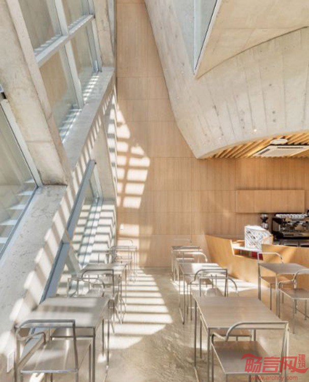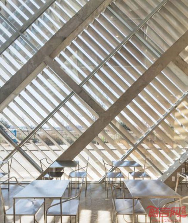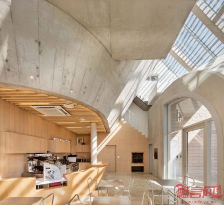 这座位于韩国Gyeonggi省Paju市的咖啡馆、住宅带有不规则的弧面外形,其外墙覆盖了铝制板材。项目由AND事务所设计。由于其独特的外墙特性,设计师将其命名为“百叶墙”住宅。百叶覆盖了一面临街的玻璃墙,一角弯曲形成了建筑的屋面。